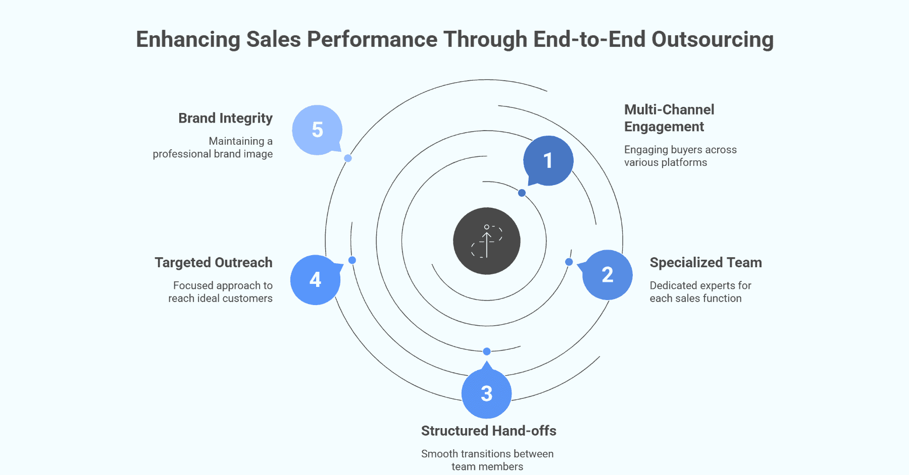 Results in sales development depend on persistence and presence across multiple touchpoints. Limiting outreach to one or two channels narrows your visibility and restricts your potential engagement. An end-to-end model ensures every part of your outbound strategy works together, amplifying results and speeding up your pipeline.